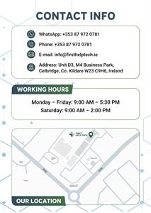 Whether it’s a broken screen, battery issue, charging problem, or software fault, our experienced technicians are here to help. Located in Celbridge, Co. Kildare, we also stock a wide range of accessories, replacement parts, and essential tech gadgets. Visit our store for walk-in repairs, or shop online 24/7 with fast delivery across Ireland. We’re committed to top-quality service, honest advice, and customer satisfaction—your local tech repair experts you can trust.